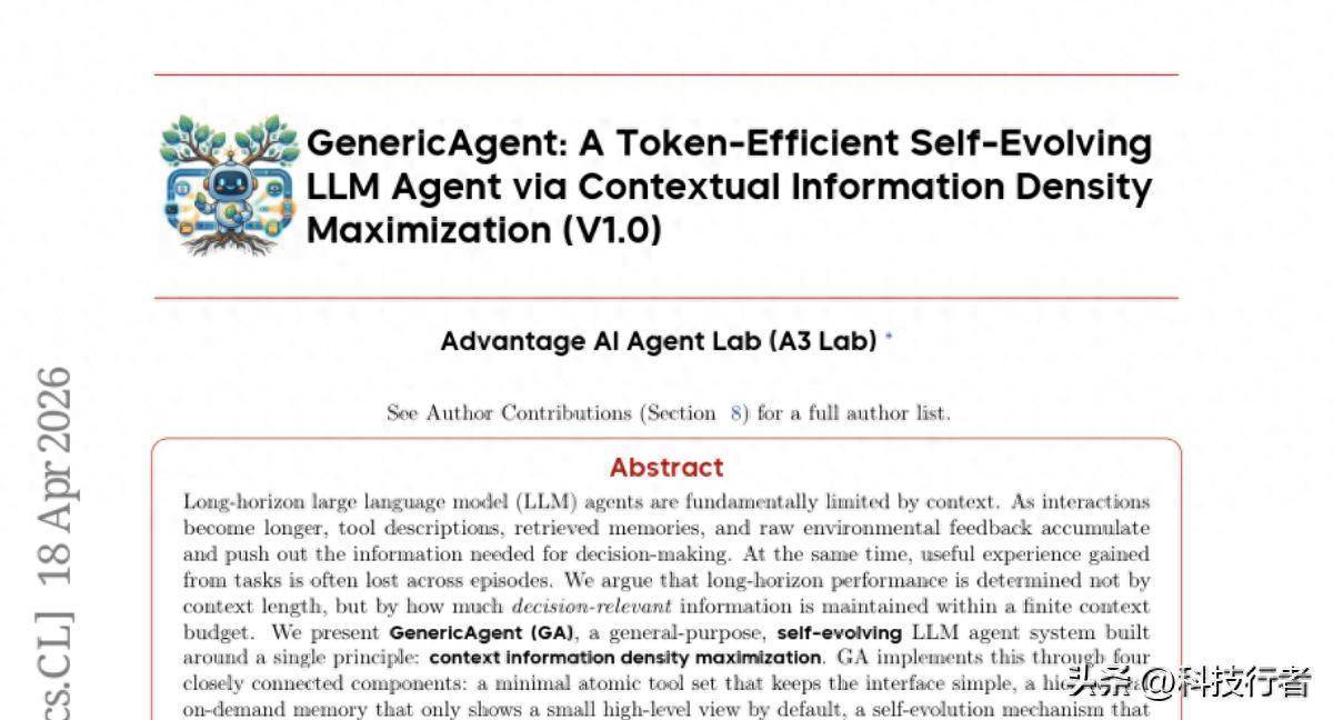 这个观察对于任何在工作或生活中使用AI助手的人都有一定的参考意义。当你发现一个AI工具在处理复杂长任务时越来越混乱,原因很可能不是模型能力不足,而是系统没有做好信息过滤,让无关内容挤占了真正重要的位置。GA提出的解法——精简接口、分级记忆、经验提炼、主动压缩——是一套可以被借鉴和延伸的工程思路。对于想要深入了解这套思路的读者,可以在arXiv上通过编号2604.17091找到完整的研究论文,研究团队也在GitHub上以lsdefine/GenericAgent公开了全部代码。