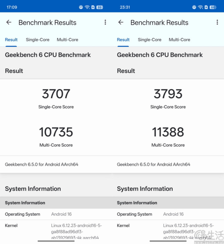 一加15 Geekbench 6.5常温(左)和低温(右)跑分