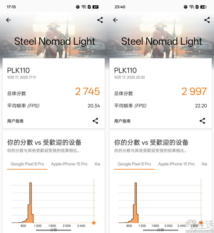 一加15 3DMARK Steel Nomad Light常温(左)和低温(右)跑分