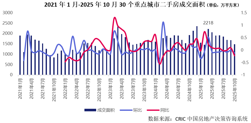 克而瑞数据显示,截至2025年10月,30个重点城市二手房成交面积为1469万平方米,环比下降12%。