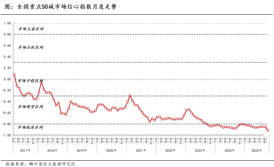 同时,市场信心指数进一步走低。根据麟评居住大数据研究院监测,10月份重点50城市场信心指数为-0.92,较上月下降0.07,同比下降0.08,市场信心指数已连续两年位于低迷区间。