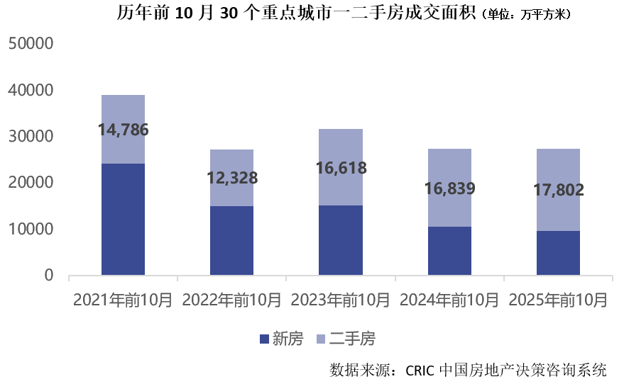 从一二手房累计成交面积来看,今年前10月30个重点城市一二手房成交总面积为27443万平方米,与2024年同期持平。