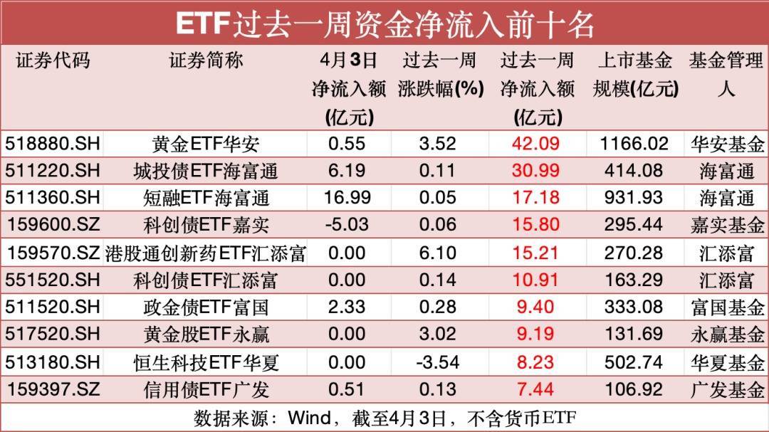 数据显示,截至4月3日,黄金ETF华安“吸金”超42亿元,位居全市场非货ETF榜首。此外,跟踪黄金股板块的黄金股ETF永赢过去一周也获得超9亿元的资金净流入,跻身全市场非货ETF前十名。