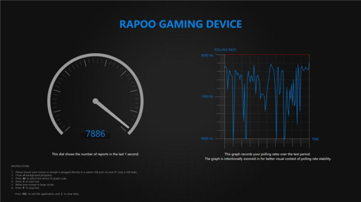 我们用雷蛇公司的PollingRateTesterApp软件对雷柏VT7金属漆鼠标进行了测试,8K回报率下实测回报率轻松超过7800,已经十分接近8K的极限。