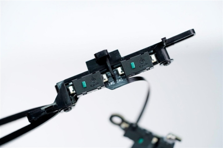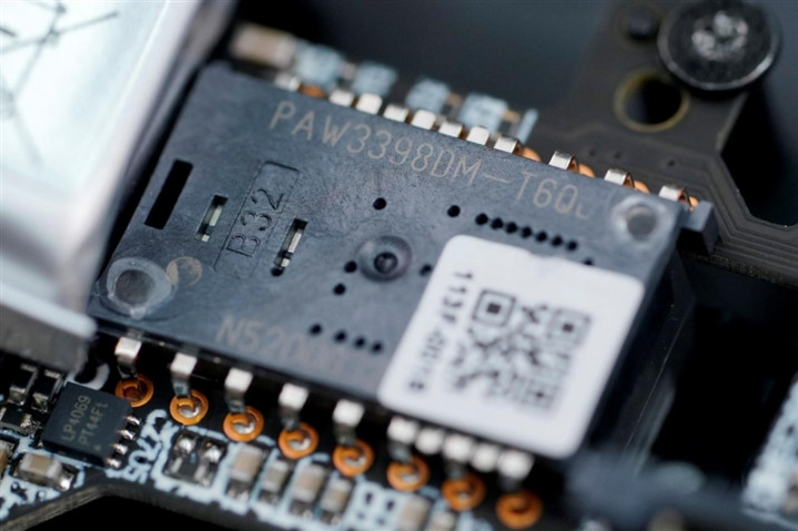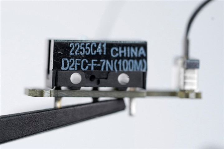 左右键使用的是来自欧姆龙的白点机械微动开关,规格为D2FC-F,压力为7N,中国制造,寿命长达一亿次点击(100M),手感清脆反馈清晰。