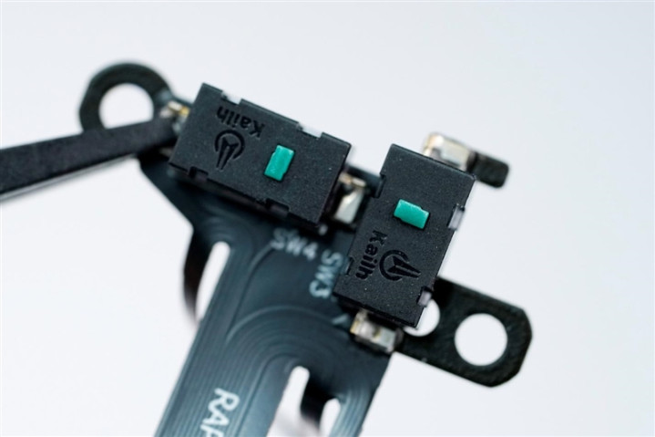 雷柏VT7金属漆鼠标侧键和背部DPI调节键都是使用凯华的长寿命mini微动开关。