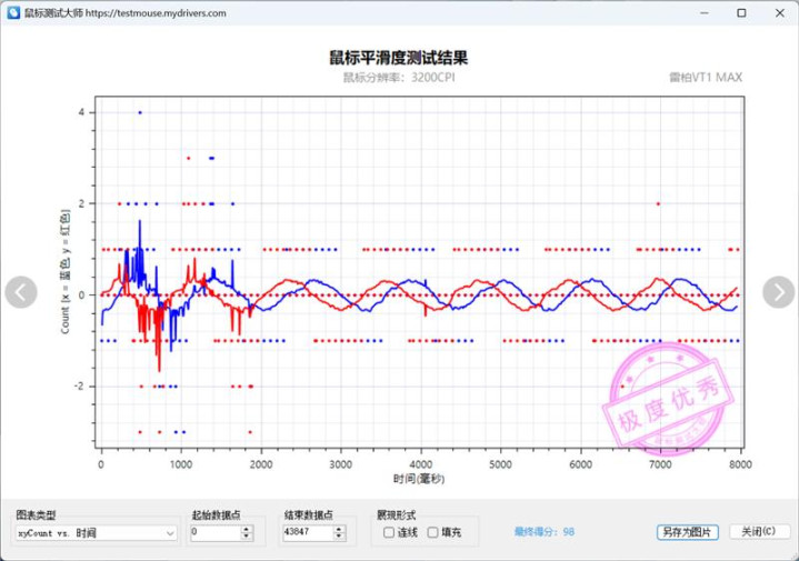 我们也用鼠标测试大师对雷柏VT7金属漆鼠标的平滑度进行测试,获得了极度优秀的评价。