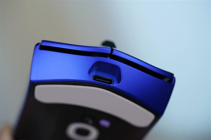 雷柏VT7金属漆鼠标的USB-C充电接口特写。