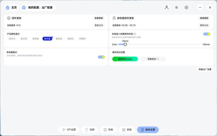我们首先把雷柏的A-Hub软件和雷柏VT7金属漆鼠标以及接收器都升级到最新版,就可以看到右下放多出了一个通讯协议设置,默认就是新的高效协议turbo,同时新的三款金属漆配色也出现在左侧产品颜色显示中。