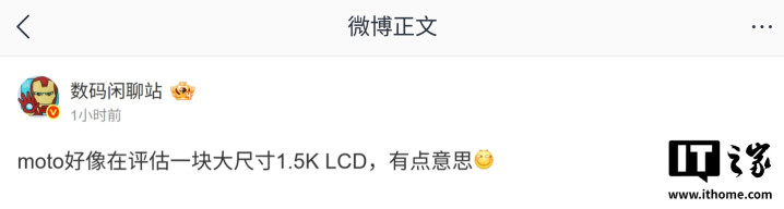 IT之家在此援引博主表述,联想moto好像在评估一块大尺寸1.5KLCD屏幕,“有点意思”,结合博主评论区回复来看,这款屏幕的尺寸大约是6.8英寸大屏,号称是“一块高端LCD”。